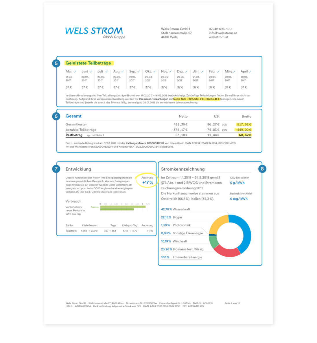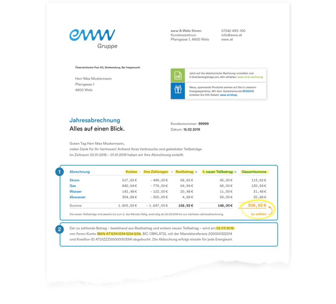 Gemeinsam mit dem ersten neuen Teilbetrag ergibt das die Gesamtsumme mit dem zu zahlenden oder als Gutschrift vorhandenen Betrag Ihrer Abrechnung.