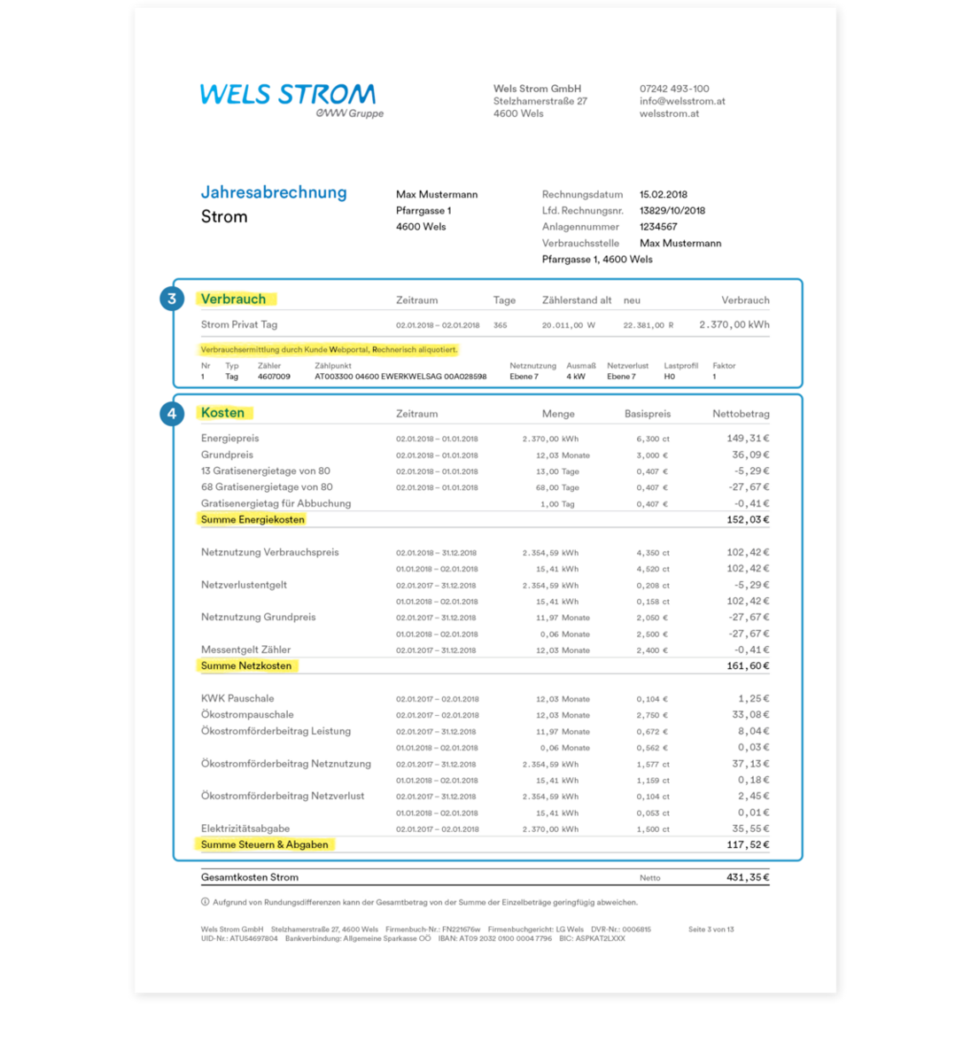 Hier werden die mit dem Verbrauch entstandenen Kosten dargestellt; gegliedert in Energie- und Netzkosten, Steuern und Abgaben.
