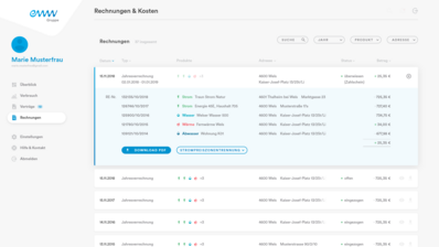 Übersichtlich dargestellt, mit den enthaltenen Produkten, Verbrauchs-Standort, Bezahlstatus und Rechnungsbetrag. Einfach als PDF downloaden oder im Detail betrachten.