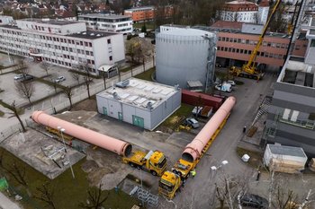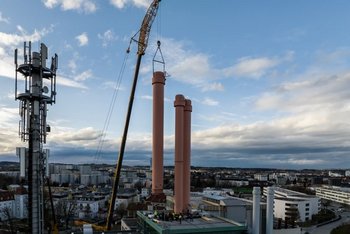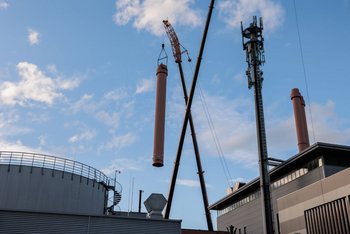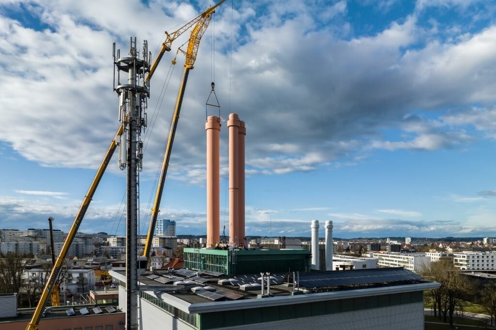Der Abbau des Fernheizkraftwerks erlebte seinen ersten bemerkenswerten Höhepunkt. Letztes Wochenende wurden die drei Schornsteine mit Hilfe von zwei Schwerlastkränen entfernt. Während am Donnerstag der starke böige Wind der spektakulären Aktion noch einen Strich durch die Rechnung machte, konnte am Freitag der erste Schornstein entfernt werden.