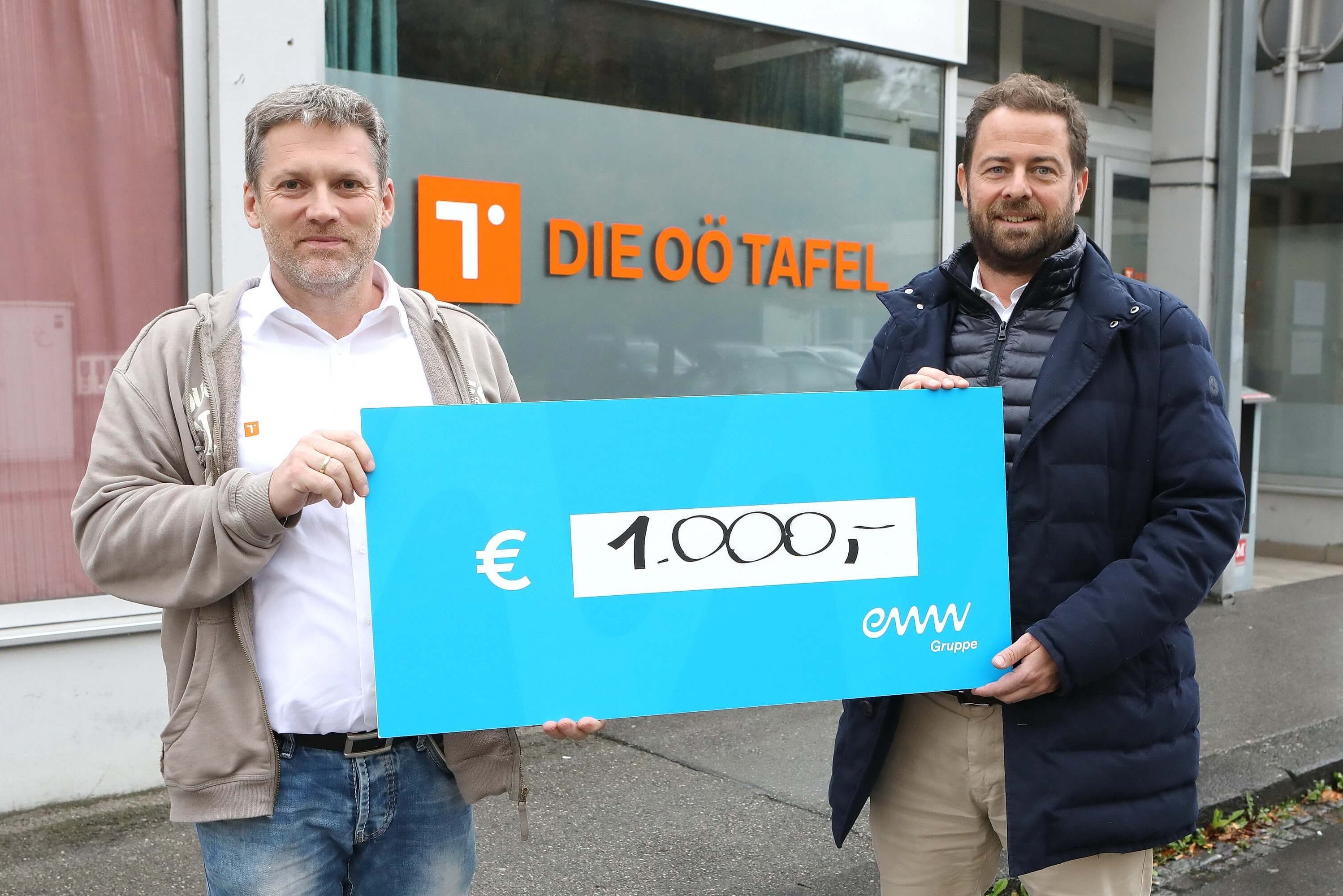 Mit einer Spende unterstützt die eww Gruppe erneut „Die OÖ Tafel“. Vorstandssprecher Florian Niedersüss überreichte Obmann Erwin Hehenberger 1.000 Euro. Das Team der Tafel stellt sich in der Welser Neustadt unermüdlich in den Dienst der Ärmsten. „In einer solch schwierigen Zeit ist es besonders wertvoll, dass uns langjährige Partner wie die eww Gruppe die Treue halten“, freut sich Erwin Hehenberger.