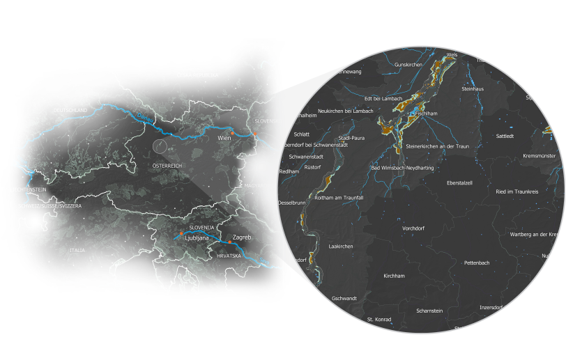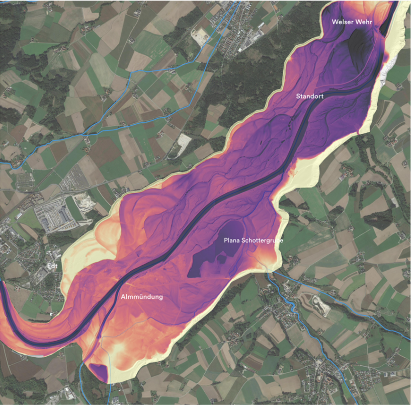 Um die Vorstellung der ehemaligen Flusslandschaft wieder zum Leben zu erwecken, können wir historische Karten betrachten. Ein hilfreiches Werkzeug ist das digitale Höhenmodell. Dieses zeigt uns, wo ehemalige Nebenarme waren und wie die Traun die Au formte — etwa zwischen Lambach und dem Welser Wehr.